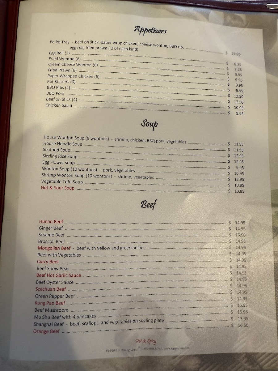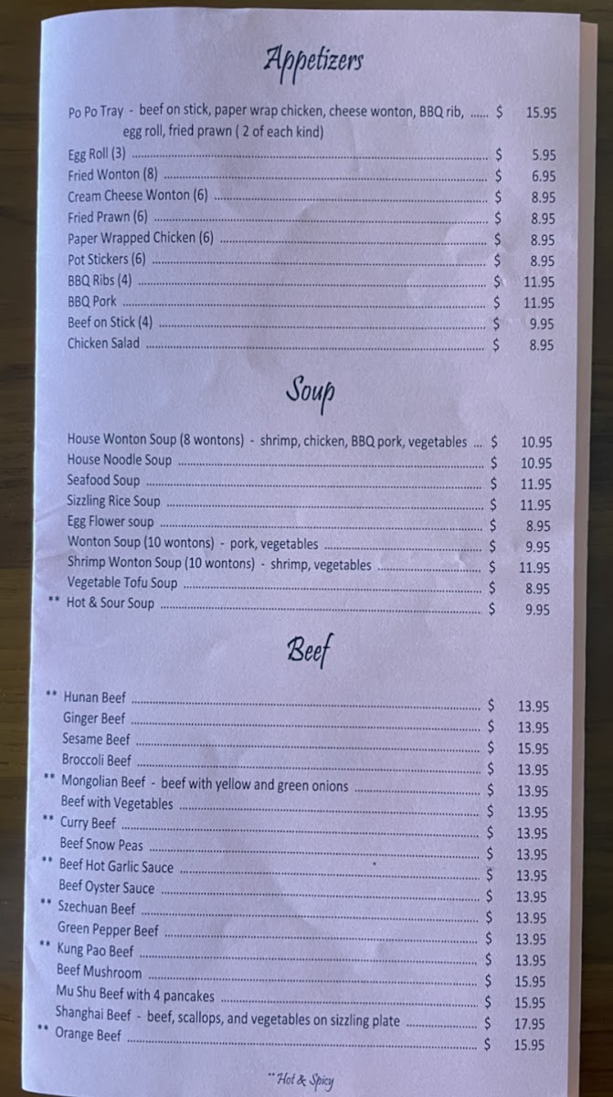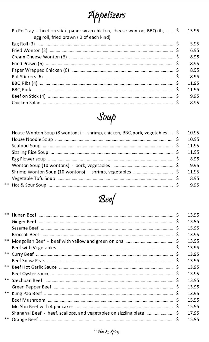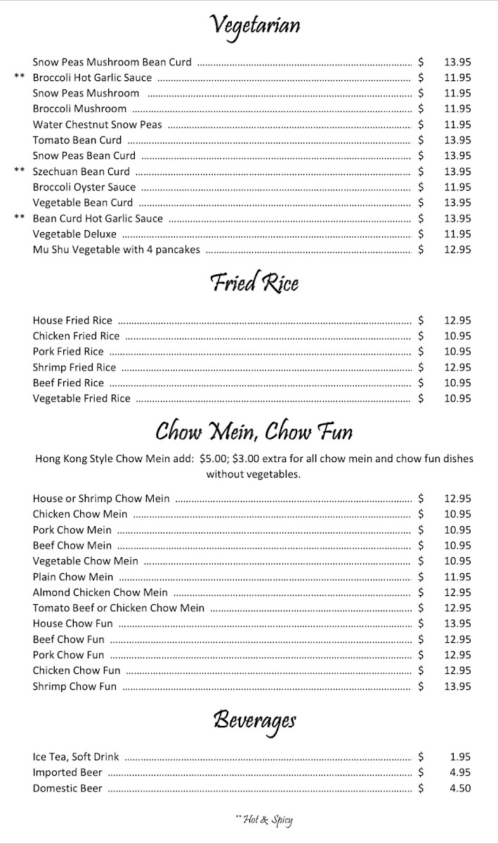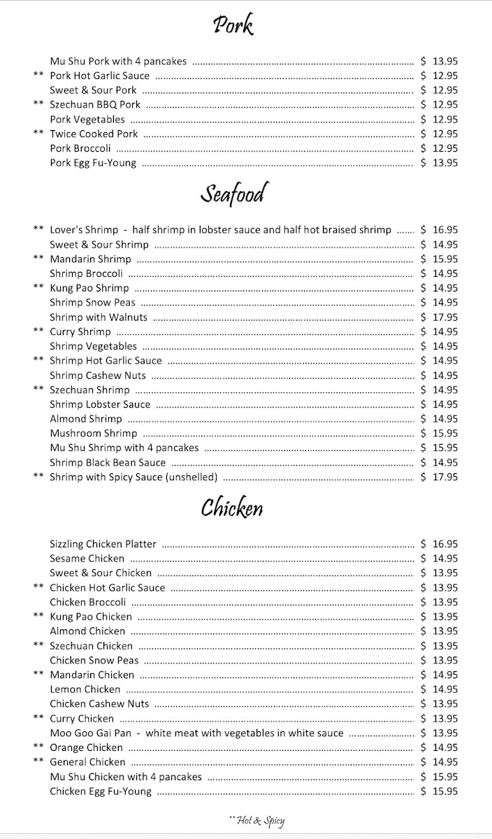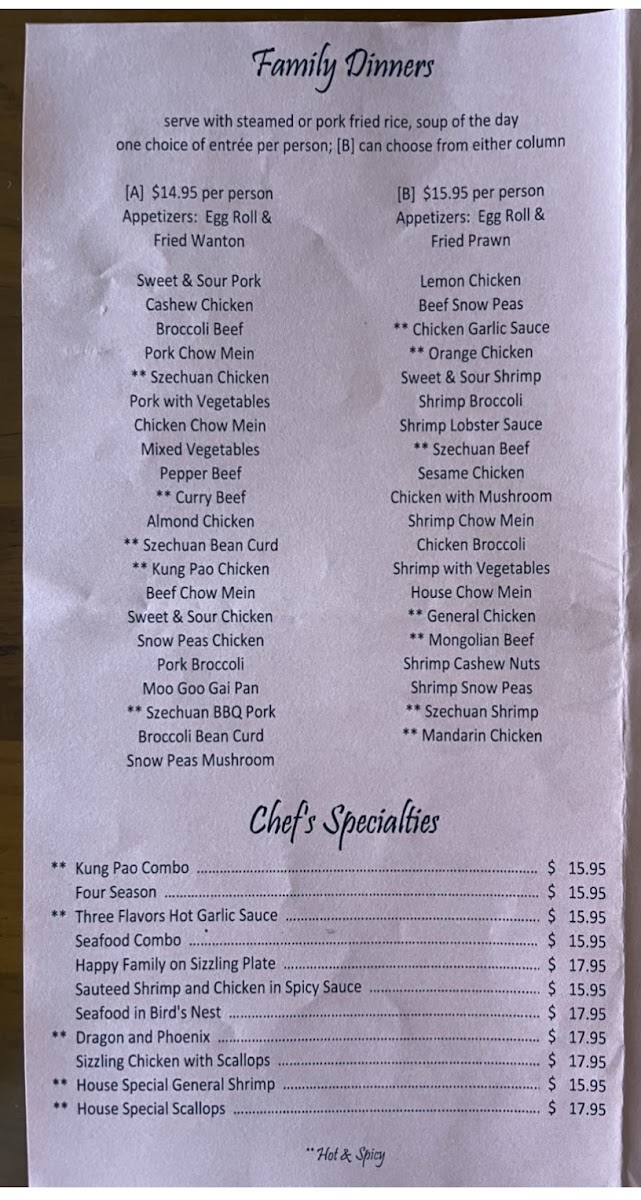 - Chef's Specialties: Highlights include the Kung Pao Combo and Happy Family On Sizzling Plate, each priced around $16.95 to $18.50.
